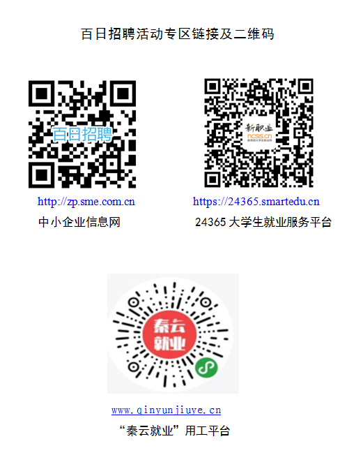 省工信厅、省教育厅、省人社厅分别在陕西省中小企业公共服务平台(www.sxsme.com)、陕西省高校毕业生就业网(http://jyweb.sneducloud.com/)、“秦云就业”用工平台(www.qinyunjiuye.cn)设置百日招聘活动链接。各市(区)工信部门组织中小企业登陆中国中小企业信息网(sme.miit.gov.cn)发布用人招聘信息,各普通高等学校组织高校毕业生登陆国家24365大学生就业服务平台(24365.smartedu.cn)发布毕业生求职信息,中小微企业和高校毕业生均可登陆“秦云就业”用工平台(www.qinyunjiuye.cn)发布招聘和求职信息(链接及二维码见附件1)。本次百日招聘活动分为两个阶段,第一阶段为2022年4月至5月,第二阶段为2022年10月至11月。