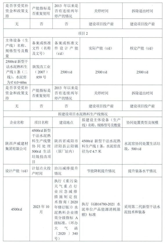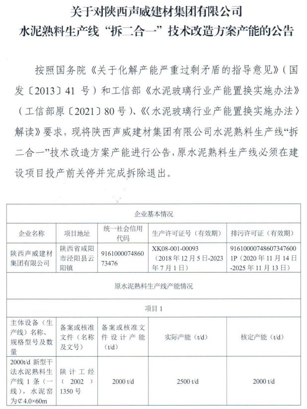 陕西省工业和信息化厅关于对陕西声威建材集团有限公司水泥熟料生产线“拆二合一”技术改造方案产能的公告 时间2022-04-08 04:26:53分类陕西省工业和信息化厅浏览4 商务喇叭版权声明:以上内容均转发自互联网,信息形式为公开信息、不含涉密信息、对本内容有异议或投诉,敬请联系网站管理员,我们将尽快回复您,谢谢合作! 原材料工业处 关于组织征集超高清视频典型应用案例的通知 (失效)关于开展2021年度武器装备科研生产许可、备案检查的通知