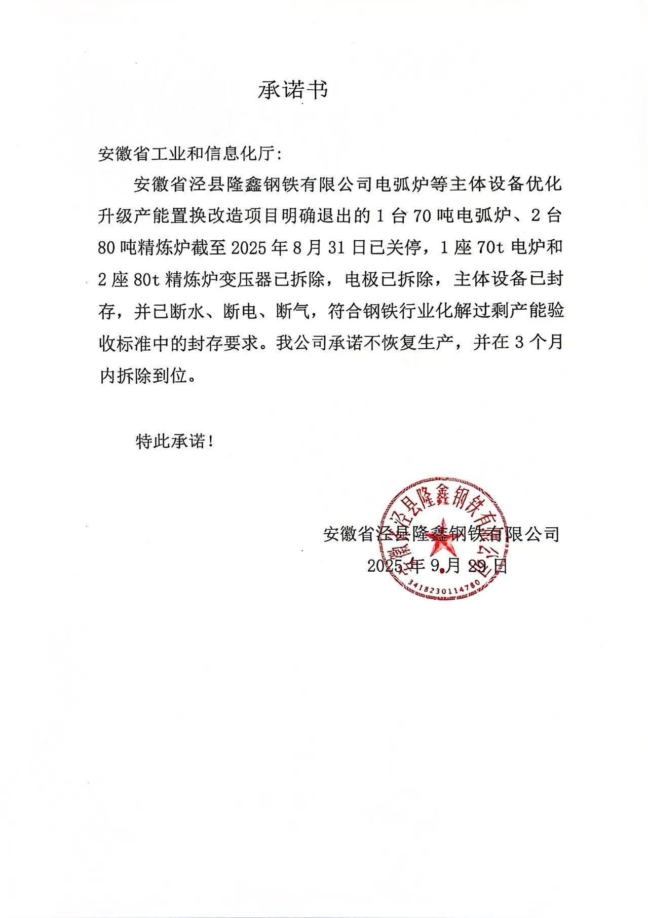 经查阅资料并现场实地核查,安徽省泾县隆鑫钢铁有限公司1座70吨电炉主体装备及供水、供电、传动、进料等辅助设施已进行破坏性拆除,不具备恢复生产条件。企业承诺3个月内拆除到位。新建主体冶炼设备为1座70吨合金钢电炉,建设地点、数量和规格型号等内容与产能置换方案、项目备案内容等一致。
