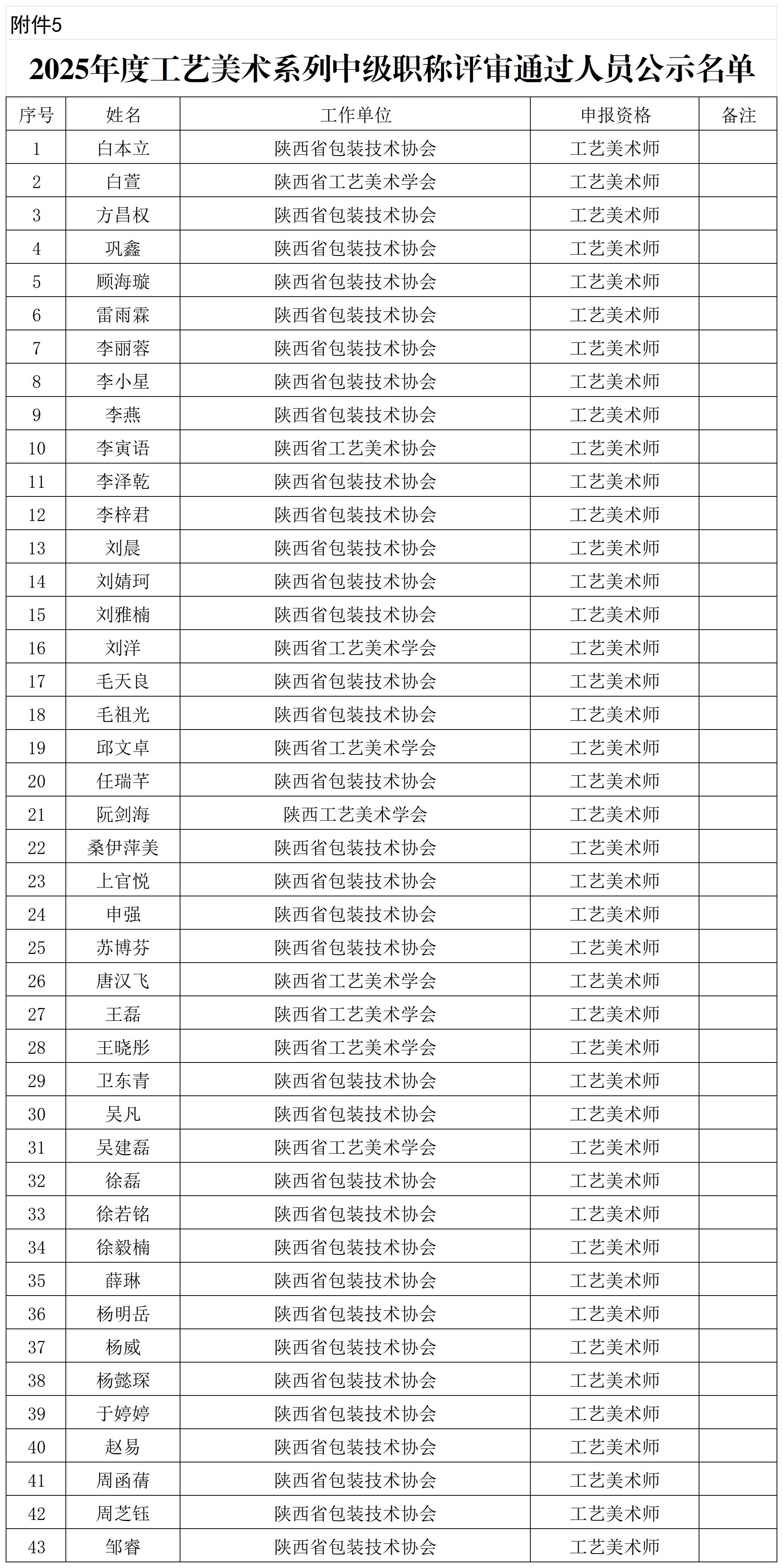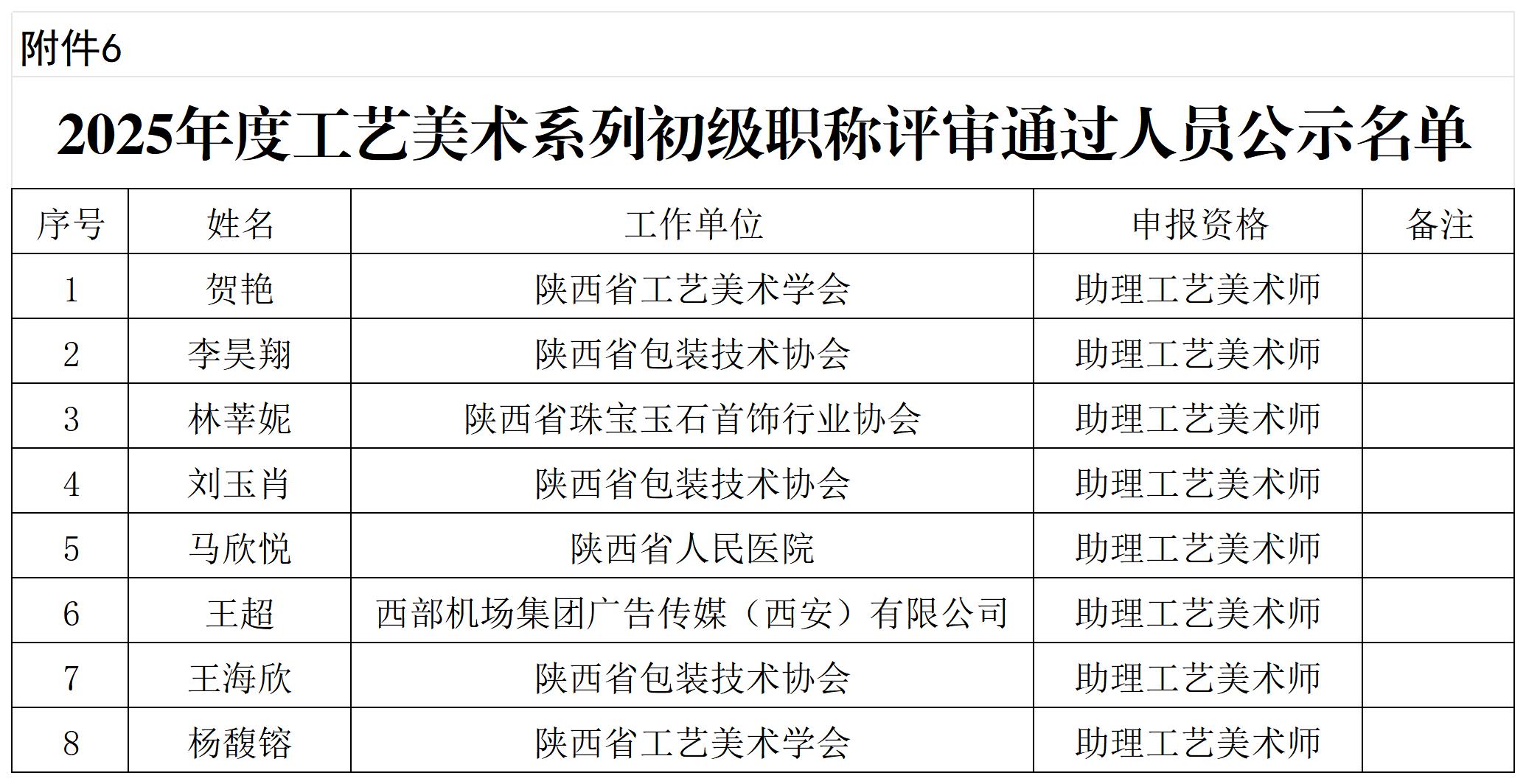 陕西省工业和信息化厅2025年度工程系列 工艺美术系列职称评审通过人员公示